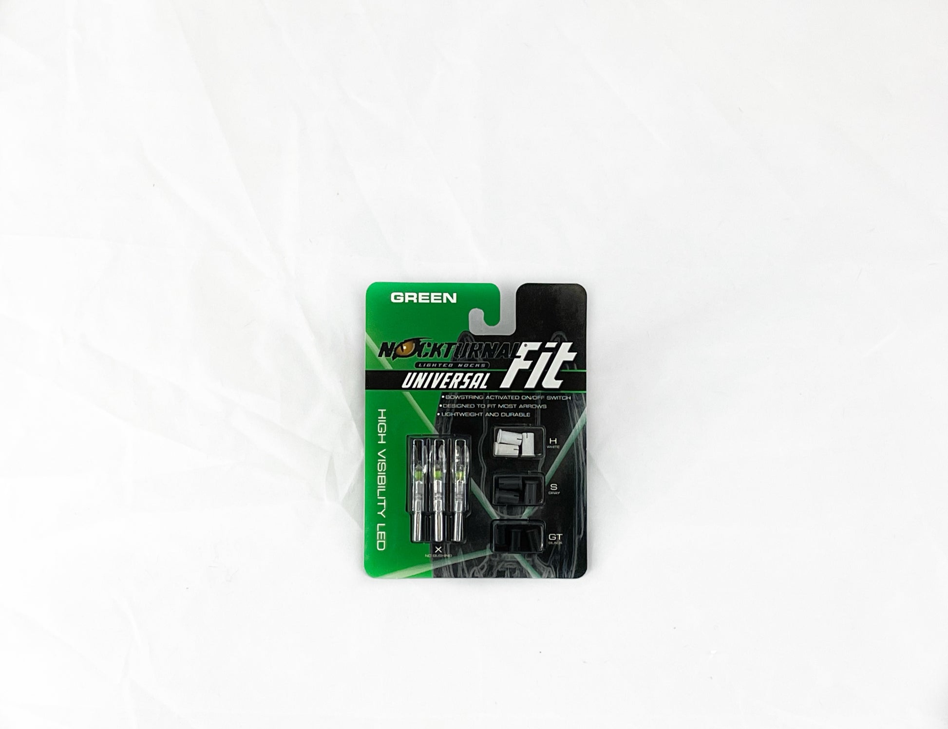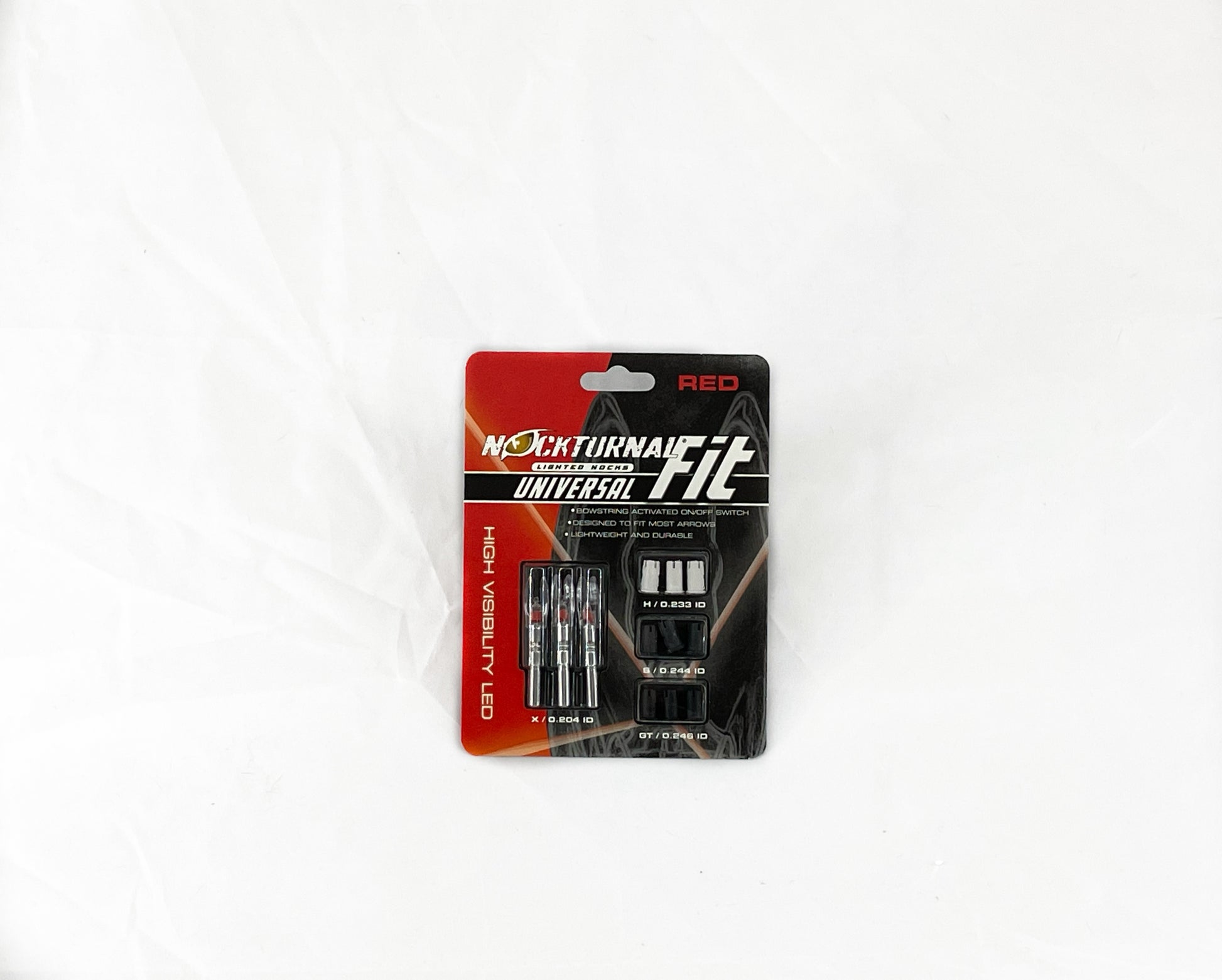 Non-Strobing FIT Nock: Designed to fit nearly every hunting arrow on the market the Nockturnal Fit non-strobing base nock will fit X-diameter arrows, and each three-pack of Fit nocks includes three sets of Nock Collar adapter sleeves to fit GT, S and H arrows. Each Fit nock features ultra-strong, impact resistant, clear polycarbonate nock construction encapsulating the super-bright single LED that’s activated by a patented string-activated, piston-driven linear contact switch. Like all Nockturnal nocks, the Fit is guaranteed to reliably activate immediately when the string is released, and it can be switched off quickly and easily with the Nockturnal Nock Tool, a small screwdriver or most broadhead tips via an opening in the side of the nock. With well in excess of 20 hours of lithium battery life, each Nockturnal Fit weights approximately 25 grains and will remain brightly lit for plenty of time of arrow retrieval and can be easily spotted in daylight or darkness.